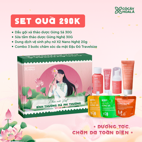 Chăm sóc toàn diện: Combo mini tắm + gội + dưỡng da (gội xả Gừng Sả + Sữa tắm Gừng Nghệ + set skincare Đậu Đỏ mini) - Tặng cặp Gội Xả Gừng Sả 30g.
