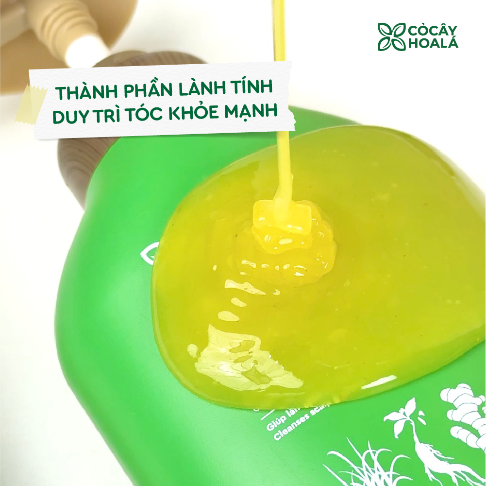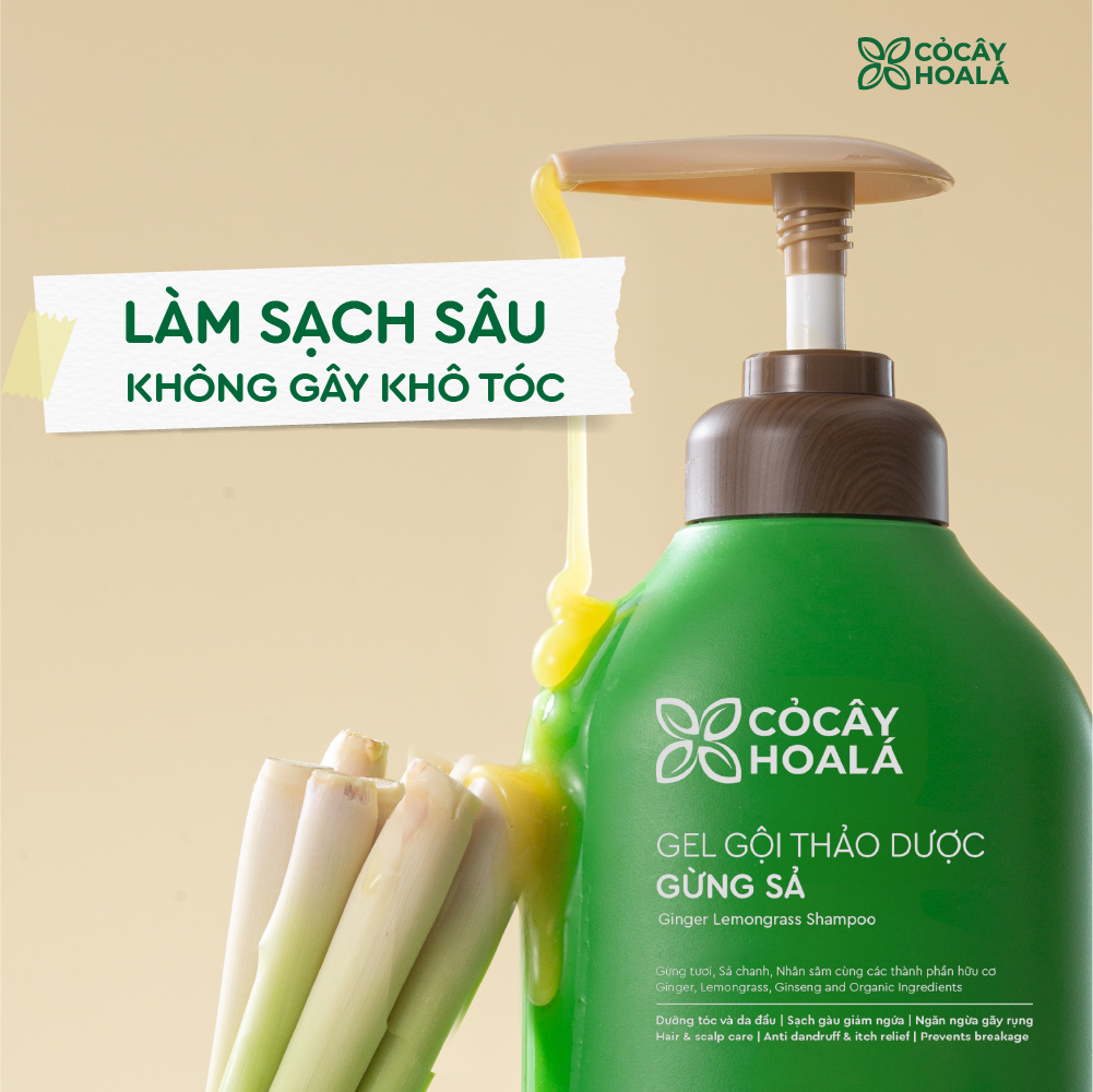 2. Dầu gội thảo dược Gừng Sả- Thành phần chính: • Gừng tươi & Bột gừng: góp phần giảm rụng – ngừa gàu, làm sạch da dầu. • Tinh dầu Sả Chanh: Mang lại mùi thơm dễ chịu, hỗ trợ làm sạch và giúp da đầu luôn cảm giác thoáng mát. • Bộ chiết xuất Táo – Đào – Ngũ cốc – Nhân sâm: Cung cấp dưỡng chất giúp tóc mềm mượt hơn, hỗ trợ cải thiện độ bóng và độ đàn hồi của sợi tóc. • Trehalose: Hỗ trợ giữ ẩm cho tóc, giúp tóc mềm mại và hạn chế tình trạng khô xơ sau khi gội. - Công dụng nổi bật: - Làm sạch da dầu và tóc: Với nguyên liệu từ gừng giúp làm sạch da dầu hiệu quả, làm sạch và ngăn n.g.ừ.a gàu. Giúp tóc chắc khỏe, mềm mượt hơn.