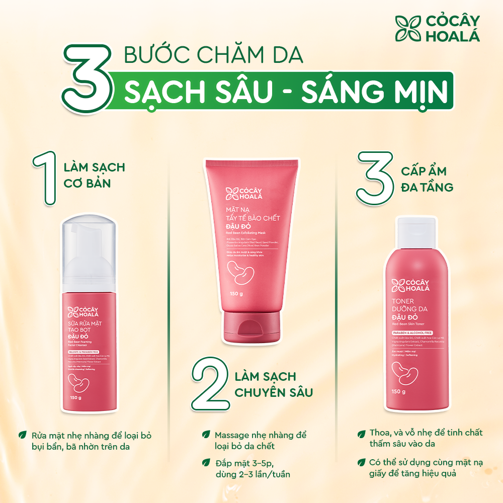 - Bước 1 - Rửa mặt: Sử dụng sữa rửa mặt tạo bọt Đậu Đỏ Cỏ Cây Hoa Lá mỗi sáng và tối. Lấy một lượng nhỏ sữa rửa mặt, tạo bọt với nước, sau đó massage lên da mặt và cổ trong 1-2 phút, rồi rửa sạch lại với nước.