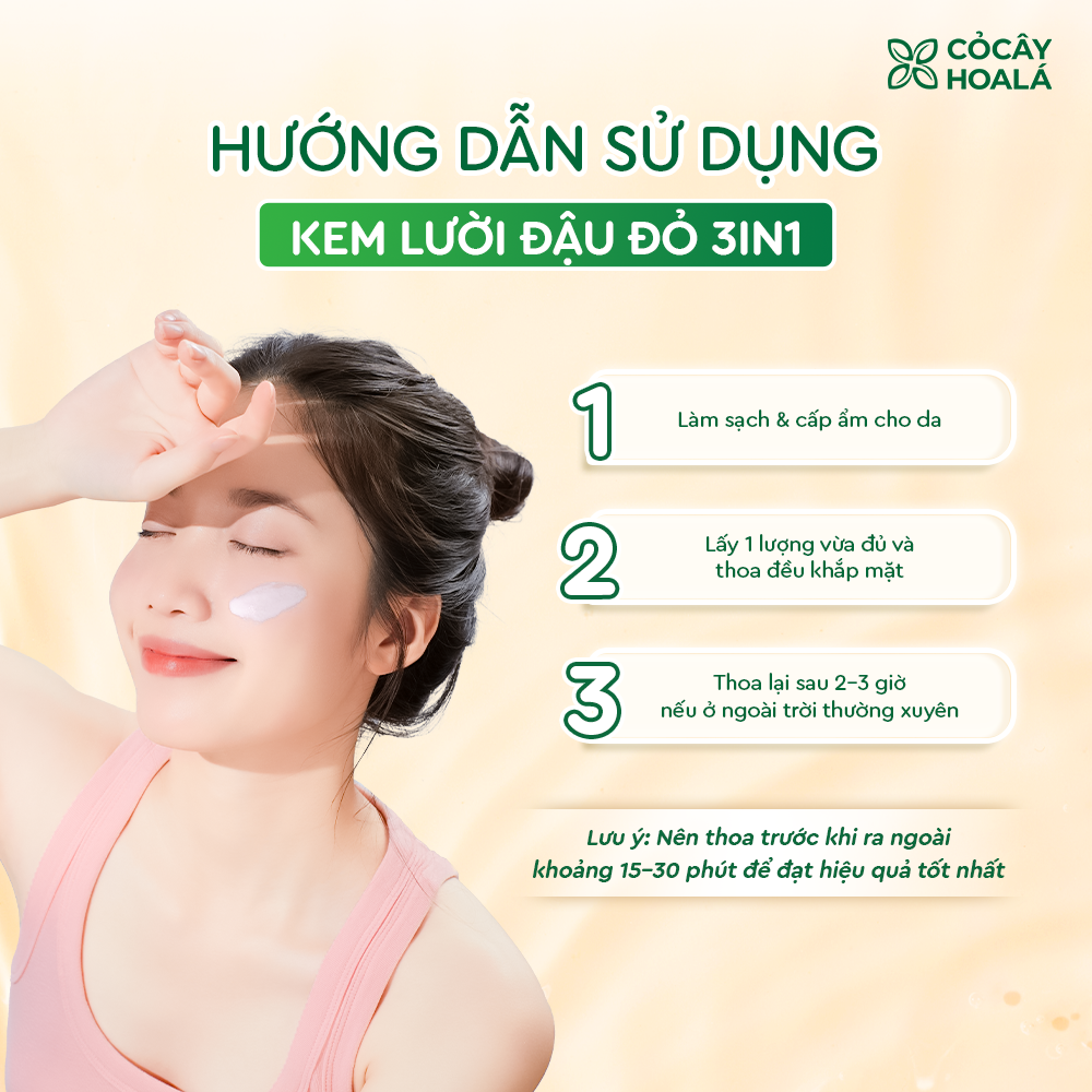 Cách sử dụng Kem Chống Nắng - Kem Lười Đậu Đỏ 3in1 Cỏ Cây Hoa Lá rất đơn giản, bạn chỉ cần thực hiện theo các bước hướng dẫn sau: