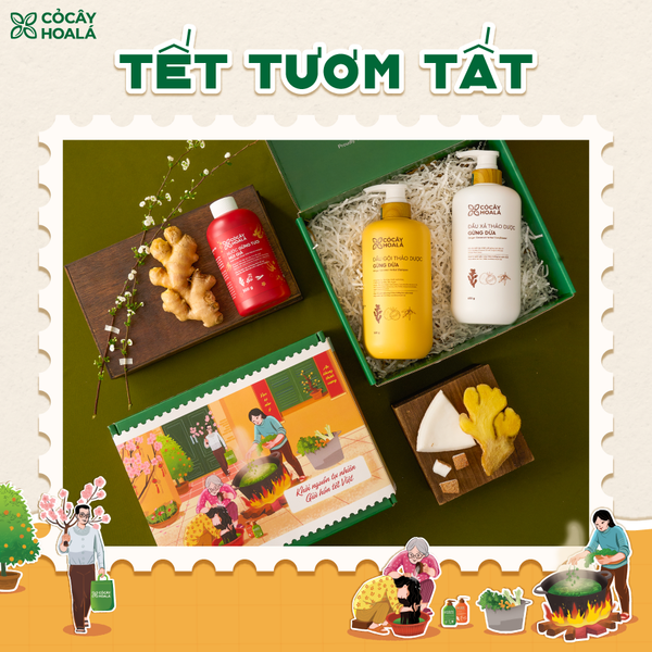 Dầu gội xả thảo dược Gừng Dừa nhẹ nhàng gột trôi những muộn phiền của năm cũ còn vương trên tóc, trong khi hơi ấm từ gừng tươi lan tỏa, là món quà chăm sóc tự nhiên mà Lá gửi trao đến bạn và những người thương yêu trong set quà Tết Tươm Tất.