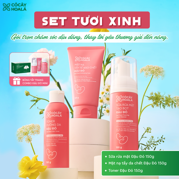 Combo Skincare Đậu Đỏ: Trọn bộ các bước chăm sóc da cơ bản với dung tích fullsize, giúp duy trì thói quen làm sạch và nuôi dưỡng da mỗi ngày một cách đều đặn. Thành phần thiên nhiên lành tính hỗ trợ làm sạch dịu nhẹ, cấp ẩm và chăm sóc da ổn định hơn theo thời gian.