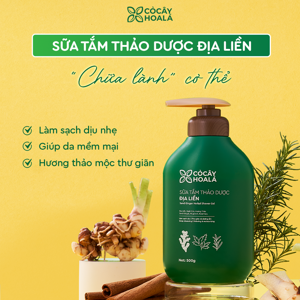 Sữa tắm thảo dược Địa Liền Cỏ Cây Hoa Lá là sản phẩm chăm sóc da phù hợp với mẹ sau sinh/ nhân viên văn phòng/ người lao động thường xuyên gặp các vấn đề đau nhức cơ thể, vai gáy tê mỏi, dễ nhạy cảm với thời tiết. Với chiết xuất từ rễ Địa Liền, Cao ngải cứu, Bột Lá hương nhu, Tinh dầu lá Lộc Đề Xanh, Tinh dầu lá Hương Thảo... Sữa tắm không chỉ giúp làm sạch da, loại bỏ bụi bẩn, dầu nhờn mà còn lưu hương thơm thảo dược dịu nhẹ sau khi dùng.