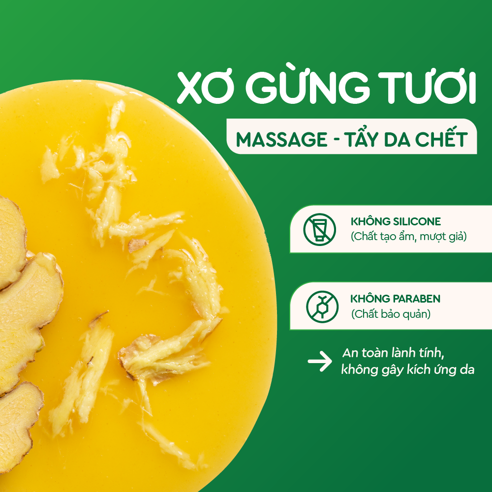 Thành phần chính | Nước gừng tươi Tinh chất rễ nghệ Chiết xuất rau má Tinh dầu khuynh diệp | |